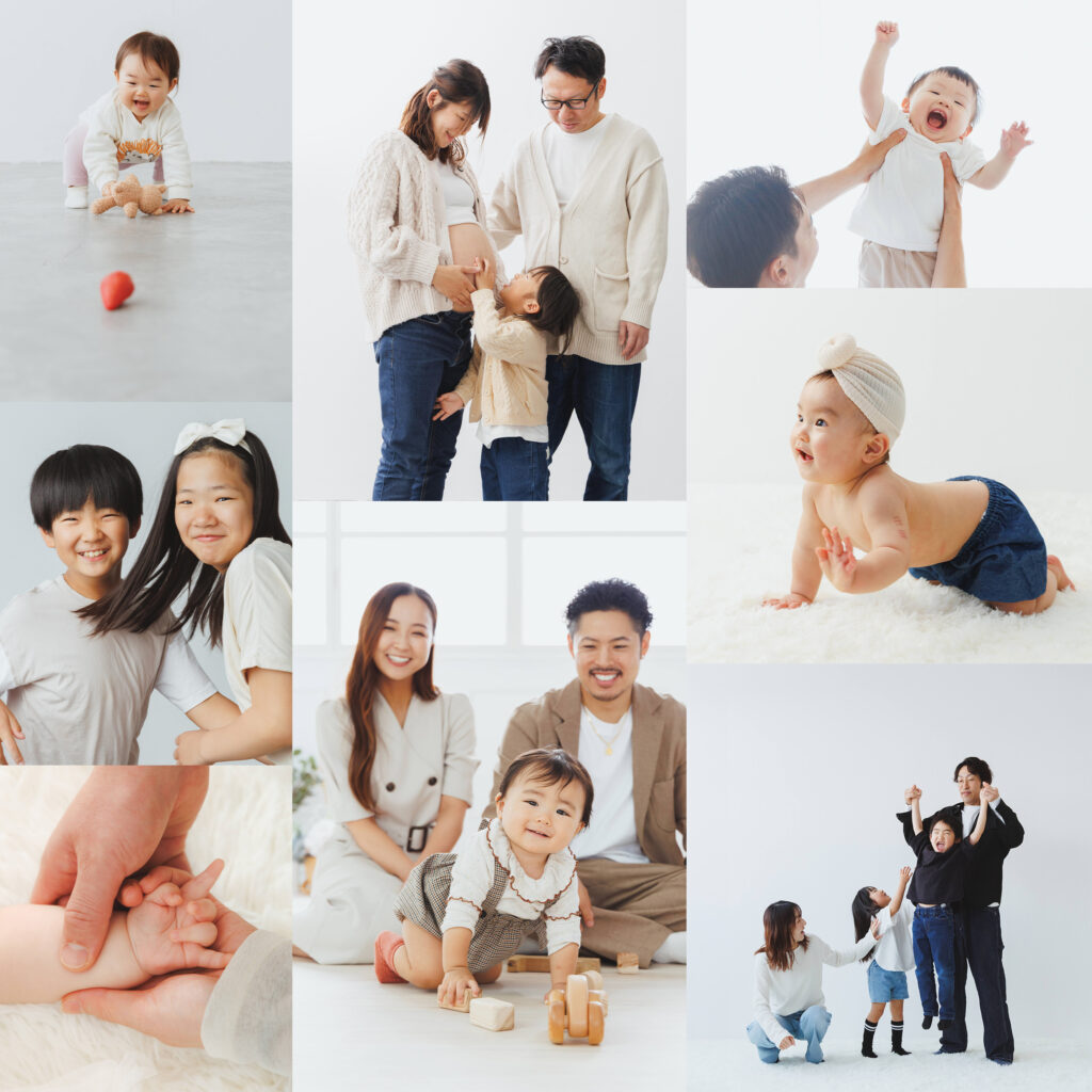 家族写真、キッズ、ベビー、ペット、マタニティ、カップルフォト、生前遺影撮影などでご利用いただけます。